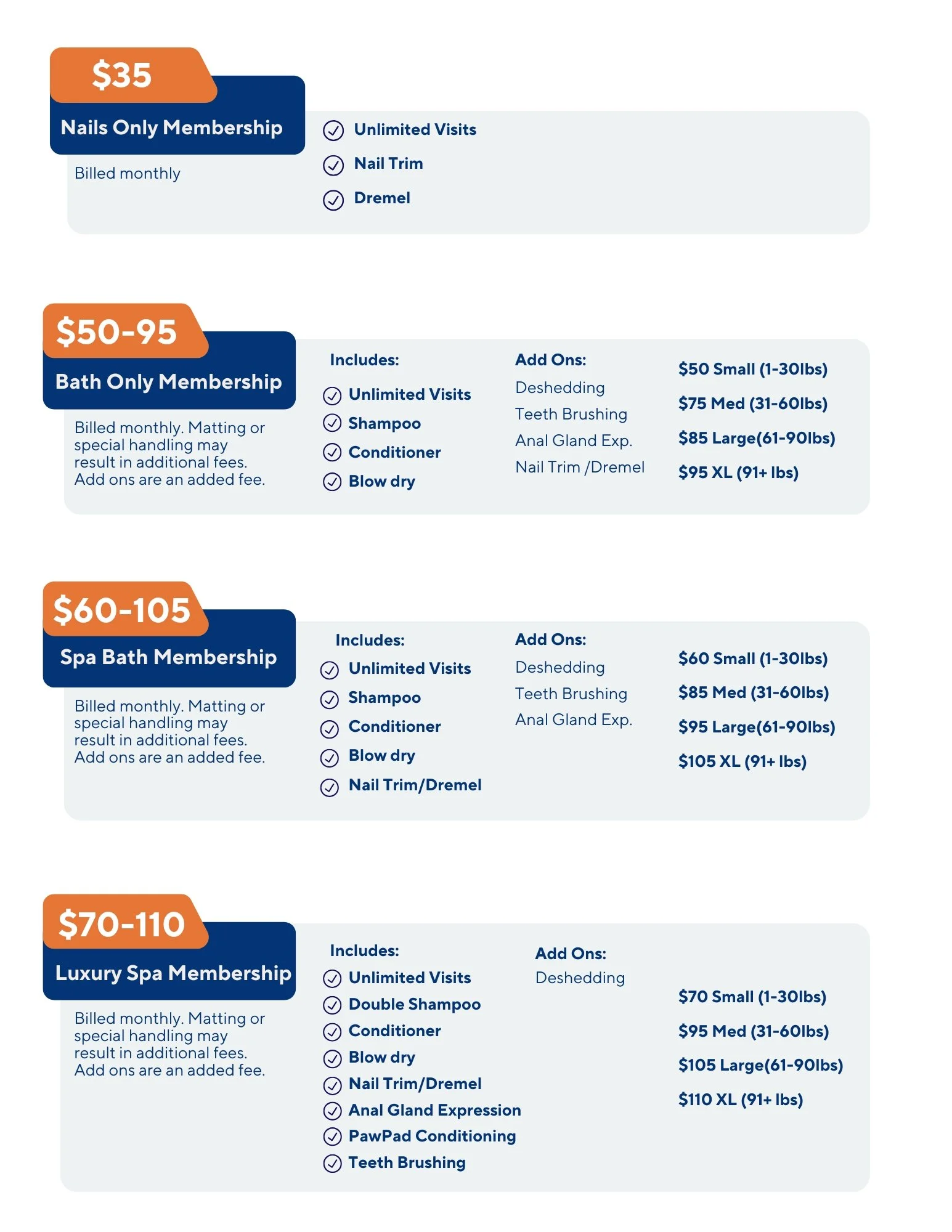 We offer everything from bathing and nail care to full styled cuts and gland expressions.